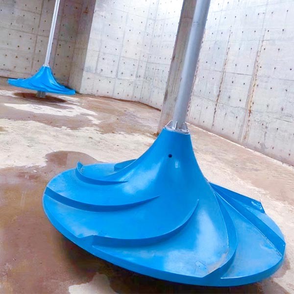 本產品具有雙層葉輪的曝氣攪拌裝置,雙曲面葉輪體上表面為雙曲線母線繞葉輪體軸線旋轉形成的雙曲面結構。其獨特的葉輪結構設計,很大限度地將流體特性與機械運動相結合。